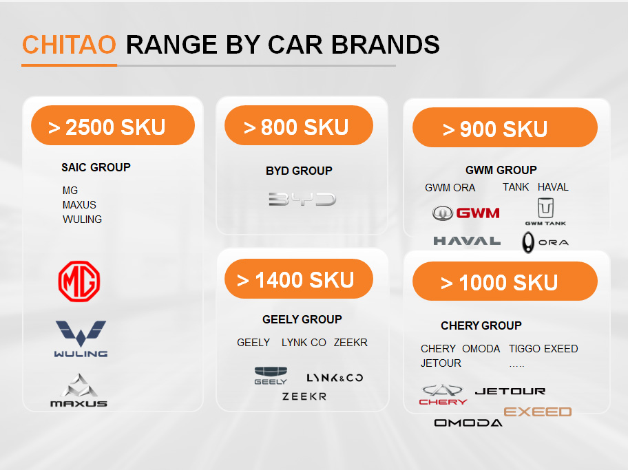 Het assortiment van CHITAO omvat meer dan 7.000 verschillende producten (SKU’s), zorgvuldig geselecteerd voor 16 Chinese automerken. Meer dan 150 OEM-leveranciers staan achter het merk, wat de kwaliteit en betrouwbaarheid van het aanbod onderstreept. Bovendien bestaat meer dan 50% van het CHITAO-assortiment uit originele onderdelen (OE-kwaliteit) — een garantie voor perfecte pasvorm, duurzaamheid en prestaties.